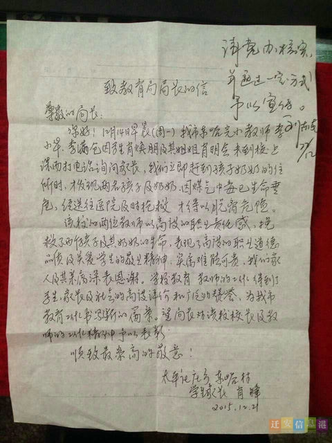 閱讀:1969遷安信息港消息(編輯:李娜)12月22日一大早,肖鋒來到遷安市教育局,送來一封感謝信,要求表揚(yáng)東蛇探峪小學(xué)兩位班主任老師,并激動(dòng)地說:“如果老師不打電話,我母親和我的兩個(gè)孩子可能會(huì)出大事,真的感謝老師”。