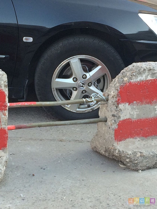 為了解事件詳情,小編立即趕往現(xiàn)場,在現(xiàn)場我們看到,一輛黑色的本田小汽車的右前車輪被鐵絲綁在旁邊的路障上,公安局已經(jīng)將雙方帶至派出所,解決此事。