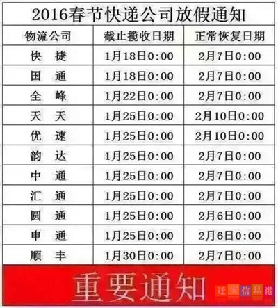 閱讀:2581遷安信息港消息(編輯:李賀娟)近日,一則名為“2016年春節(jié)快遞公司放假通知”的消息在朋友圈瘋傳,其中詳細(xì)列出了11家快遞公司截止攬收、正?;謴?fù)日期,那么,這一消息是否屬實(shí)呢?今日,小編就此事向遷安各快遞公司進(jìn)行了求證。