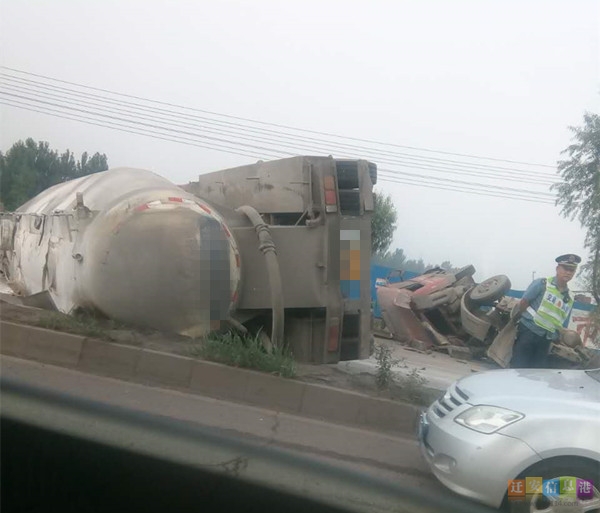 據(jù)熱心市民介紹,今天上午8:30左右,他經(jīng)由楊柏線木廠口鎮(zhèn)政府附近路段時看到,一輛大罐車翻倒在路面上,車身與車頭分家,現(xiàn)場十分慘烈。據(jù)這位市民講述,在現(xiàn)場并沒有看到大罐車司機(jī),具體傷亡情況不明,現(xiàn)場也沒有看到其他車輛,事故原因可能是大罐車騎到中間隔離帶所致,事故具體起因有待官方調(diào)查。交警等相關(guān)人員已趕到現(xiàn)場。