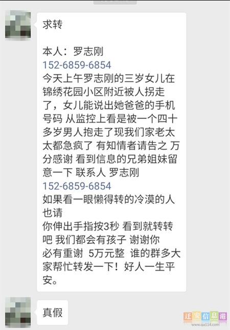 遷安信息港消息:近日,遷安人的微信群、朋友圈以及QQ群里又開(kāi)始流傳這樣一條信息,內(nèi)容大致是:“今天上午羅志剛的三歲女兒在錦繡花園小區(qū)附近被人拐走了,女兒能說(shuō)出她爸爸的手機(jī)號(hào)碼,從監(jiān)控上看是被一個(gè)四十多歲男人抱走了?,F(xiàn)我們家老太太都急瘋了,有知情者請(qǐng)告之,萬(wàn)分感謝??吹叫畔⒌男值芙忝昧粢庖幌?,如果看一眼懶得轉(zhuǎn)的冷漠的人也請(qǐng)你伸出手指按3秒,看到就轉(zhuǎn)轉(zhuǎn)吧!我們都會(huì)有孩子,謝謝你,必有重謝 5萬(wàn)元。誰(shuí)的群多大家?guī)兔D(zhuǎn)發(fā)一下!好人一生平安?!蔽⑿胖校€留下了“羅志剛”的電話:15268596854。