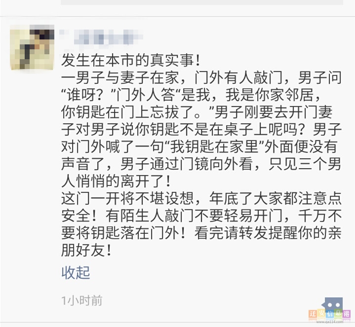 這則消息原文為:發(fā)生在本市的真實(shí)事!一男子與妻子在家,門外有人敲門,男子問:“誰呀?”門外人答:“是我,我是你家鄰居,你鑰匙在門上忘拔了?!蹦凶觿傄ラ_門,妻子對(duì)男子說,“你鑰匙不是在桌子上呢嗎?”男子對(duì)門外喊了一句:“我鑰匙在家里。”外面便沒有聲音了,男子通過門鏡向外看,只見三個(gè)男人悄悄的離開了!這門一開將不堪設(shè)想,年底了大家都注意點(diǎn)安全!有陌生人敲門不要輕易開門,千萬不要將鑰匙落在門外!看完請(qǐng)轉(zhuǎn)發(fā)提醒你的親朋好友!