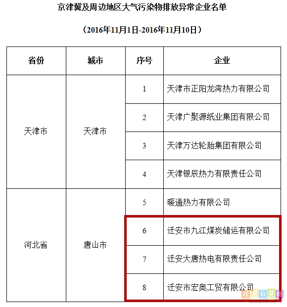 遷安信息港消息:11月11日,環(huán)保部向社會(huì)公布了2016年11月1日至10日期間,重點(diǎn)污染源自動(dòng)監(jiān)控系統(tǒng)發(fā)現(xiàn)的京津冀及周邊地區(qū)大氣污染物排放數(shù)據(jù)異常、涉嫌超標(biāo)的8家企業(yè)名單,涉及天津市及河北唐山市等兩個(gè)城市,其中遷安市有三家企業(yè)上榜,分別為遷安市九江煤炭?jī)?chǔ)運(yùn)有限公司、遷安大唐熱電有限責(zé)任公司及遷安市宏奧工貿(mào)有限公司。