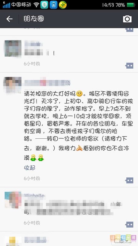 請關掉您的大燈好嗎。城區(qū)不要使用遠光燈!天冷了,上初中、高中騎自行車的孩子們穿的厚了,動作笨拙了。早上7點不到就去學校,晚上6一10點才能放學回家,頂著星月,冒著嚴寒。開車的各位朋友,車里有空調(diào) ,不要去責怪孩子們偶爾的搶路。(請接力下去,謝謝!)