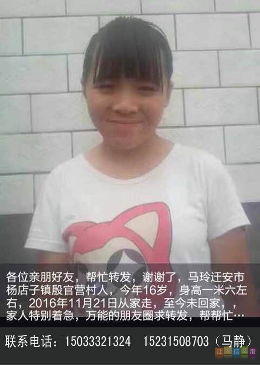 據(jù)了解,離家的16歲女孩名叫馬玲,家住遷安市楊店子鎮(zhèn)殷官營(yíng)村,身高一米六左右,于今年輟學(xué)。2016年11月21日上午11點(diǎn)半左右離家,至今未回家。據(jù)姐姐馬女士講述,她是被一名三十多歲的男子帶走的,該男子是馬女士的網(wǎng)友,以其女兒車禍需要人照顧為由,騙16歲馬玲為他女兒陪床。
