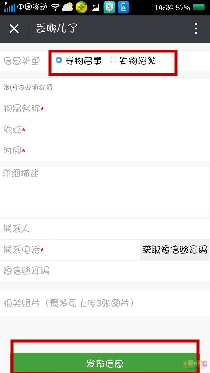 第三步,選擇“尋物啟事或事物招領(lǐng)”,填寫完成后,點擊“發(fā)布信息”