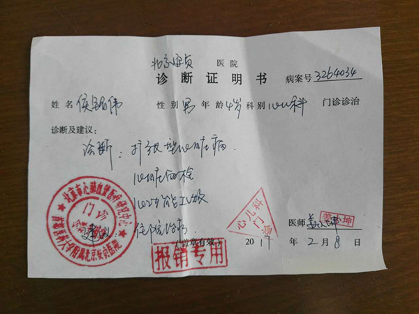 據(jù)侯春田講述,2016年7月,兒子侯銘偉開始出現(xiàn)抽搐癥狀,后輾轉(zhuǎn)唐山多家醫(yī)院檢查,沒有取得很好的效果。為了能治好孩子,侯春田又帶著孩子去北京幾家醫(yī)院治療,在北京市安貞醫(yī)院確診為擴(kuò)張型心臟病。從唐山輾轉(zhuǎn)北京,在此期間花費(fèi)近7萬元。