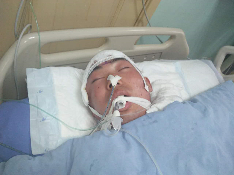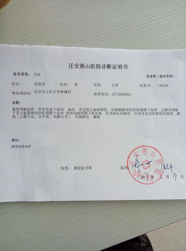 正月初二小兒子何建禹騎著家里的電動(dòng)三輪車去親戚家,離家時(shí)還開開心心的,不想傍晚回家時(shí)卻發(fā)生了車禍,被一輛面包車追尾,撞出30米遠(yuǎn),當(dāng)場(chǎng)昏迷,后被送往燕山醫(yī)院救治,確診為重型顱腦損傷,至今仍在重癥監(jiān)護(hù)室中昏迷不醒。