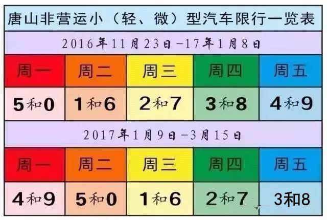 2017年1月9日至3月15日,工作日周一至周五分別限行4和9、5和0、1和6、2和7、3和8。