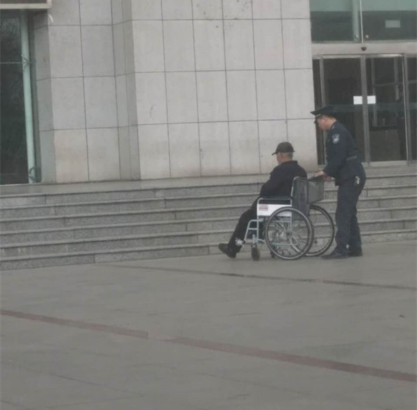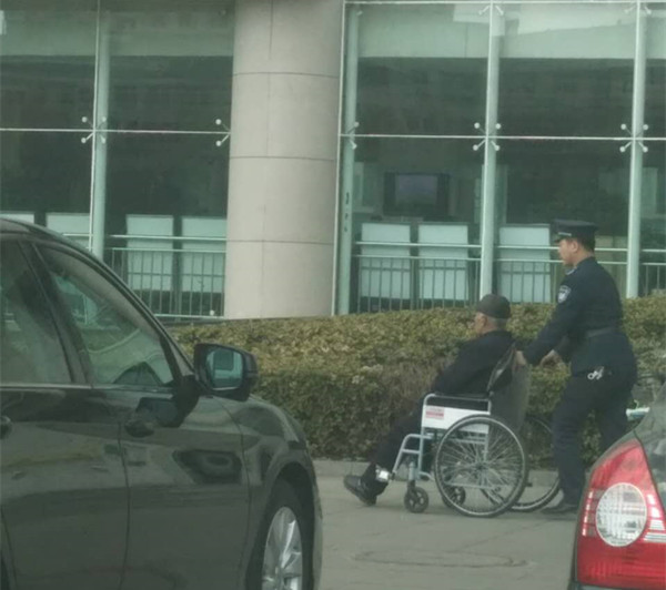 據(jù)葉先生講述,今天下午兩點(diǎn)五十分左右,他到燕山醫(yī)院附近的農(nóng)村信用社辦理業(yè)務(wù)。出門時(shí)看到一名身穿保安制服的男子拿著輪椅走向門外。出于好奇,走到停車場(chǎng)的葉先生多看了一眼,也正是眼前的一幕讓他十分感動(dòng)。“那名男子將輪椅放在了一位頭發(fā)花白的老人面前,從一側(cè)的便道推著老人進(jìn)入大廳辦理業(yè)務(wù)”,葉先生稱,或是因?yàn)槔先四晔乱迅撸饶_不便無法邁上臺(tái)階,男子才從大廳內(nèi)找來輪椅,推老人進(jìn)入大廳辦理業(yè)務(wù)。