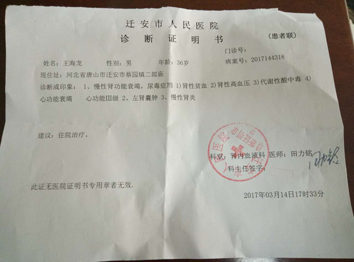 今年三月份,王海龍出現(xiàn)臉色青黑、渾身無力、嗜睡、不吃葷腥等癥狀。在愛人蔡金煥的勸說下,王海龍到遷安市人民醫(yī)院檢查,被診斷出尿毒癥。如晴天霹靂,一家人陷入深深的痛苦中。
