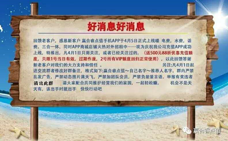 享受到贏合睿點值充話費的大幅優(yōu)惠后,4月1日該平臺發(fā)布活動信息,稱為慶祝4月5日贏合睿點值手機APP正式上線,特推出優(yōu)惠活動:凡4月1日只需關(guān)注,或已關(guān)注過的(送500元8.8折優(yōu)惠充值額度,只限1號當(dāng)日有效,過期作廢,2號所有VIP額度回歸正常使用)??吹竭@條信息后,徐先生和其愛人將這一信息分享給他們的200多個好友。