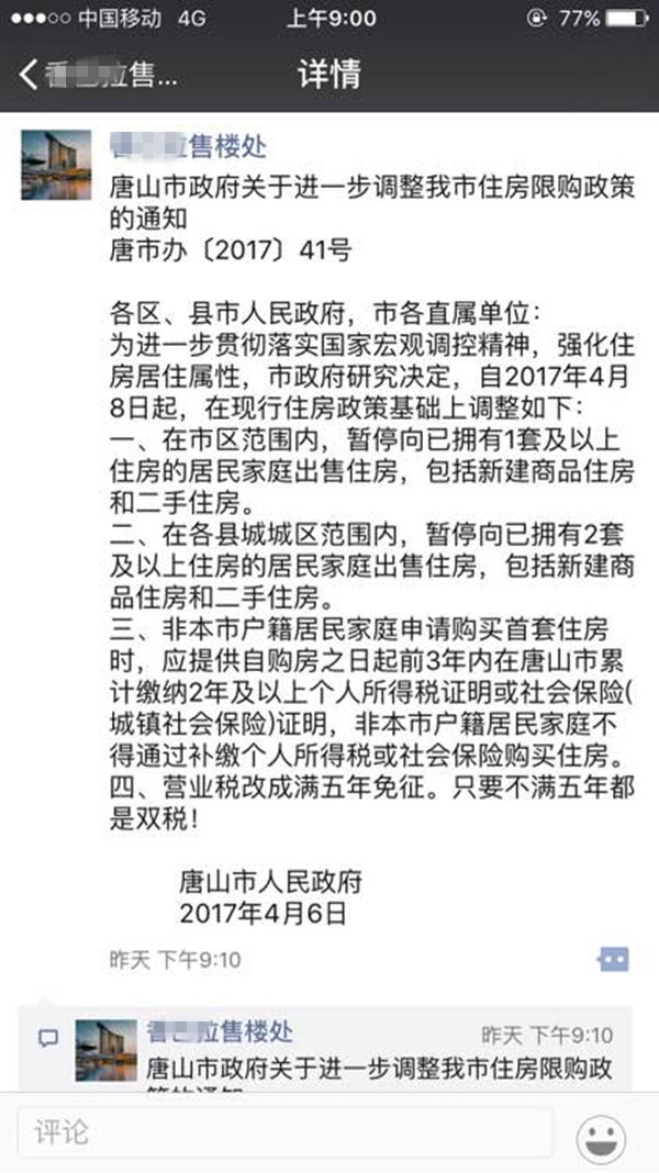 今年以來(lái),樓市風(fēng)云變幻,每一則可能引起樓市變動(dòng)的消息都牽動(dòng)著市民的心。近兩日,一則“唐山市政府關(guān)于進(jìn)一步調(diào)整我市住房政策的通知”從一些房產(chǎn)銷售人員、朋友圈傳出,消息稱,4月8日起,唐山開始實(shí)行限購(gòu)政策,并列舉了三項(xiàng)調(diào)整辦法。消息一經(jīng)傳出,就以裂變的速度瘋傳,近兩日,網(wǎng)友紛紛向本平臺(tái)咨詢:是否真的確有此事?