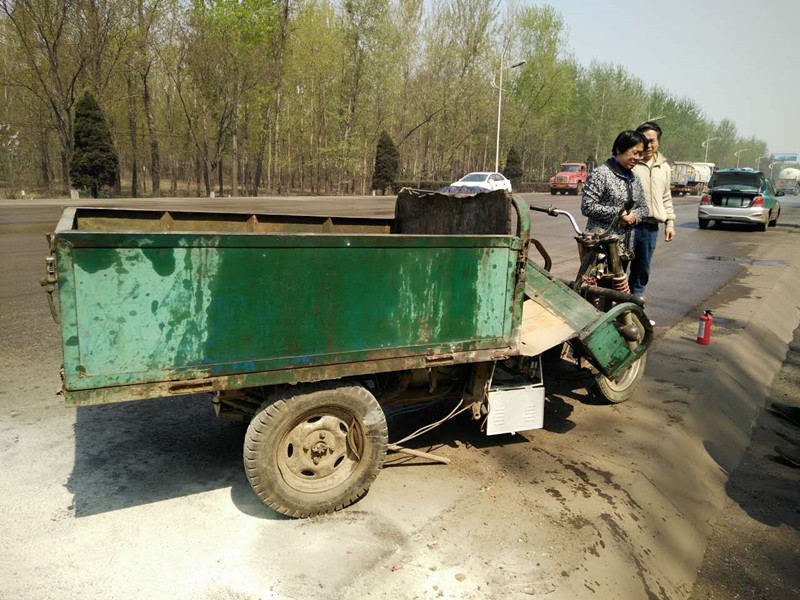 據(jù)悉,昨天上午王春兄妹三人打出租車回老家辦事,回來途經(jīng)平青大線大楊官營附近時發(fā)現(xiàn)一老漢騎三輪車翻倒在路邊,車底黑煙滾滾,火焰亂竄,老漢則痛苦的倒在地上求救。但因火勢較大,加之油箱可能泄露,車輛隨時有爆炸的危險,一時間無人敢靠近。