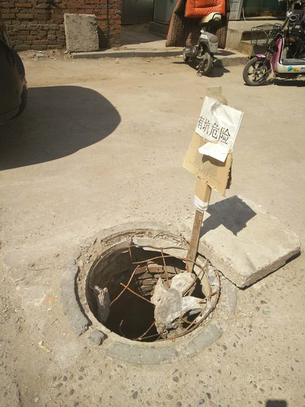 據(jù)市民講述,此處井蓋損壞已有半月時(shí)間,雖有好心人在旁邊豎起了“有坑危險(xiǎn)”的警示牌,但還是給過(guò)往的車輛和行人帶來(lái)了諸多的不便?!鞍滋爝€好一點(diǎn),大家都能看到豎起的警示牌,但晚上根本看不見(jiàn),現(xiàn)在天氣越來(lái)月暖和,晚上外出散步的人比較多,但這里井蓋缺失,對(duì)于散步的市民來(lái)說(shuō)太危險(xiǎn)了,尤其是老人和孩子?!笔忻駬?dān)心道。
