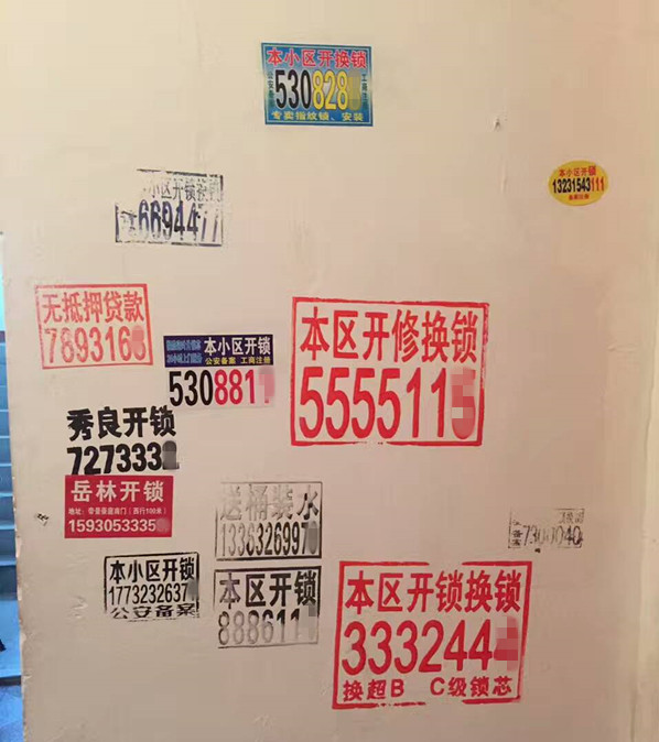 在市民李先生發(fā)來(lái)的照片中可以看到,門(mén)上被各式小廣告占據(jù),尤其以開(kāi)鎖廣告居多。據(jù)李先生講述,“這還不是廣告最多的時(shí)候,最多的時(shí)候一扇門(mén)上有二十多個(gè)小廣告,全部粘在門(mén)上的,很難清理”,門(mén)上的小廣告居多,但還有一些商家將廣告印在墻壁上,清理后會(huì)留下一個(gè)深深的“疤痕”。