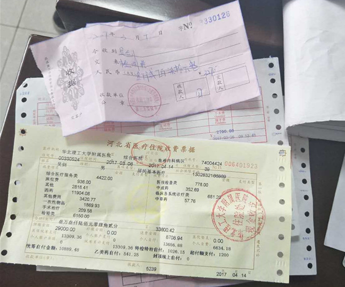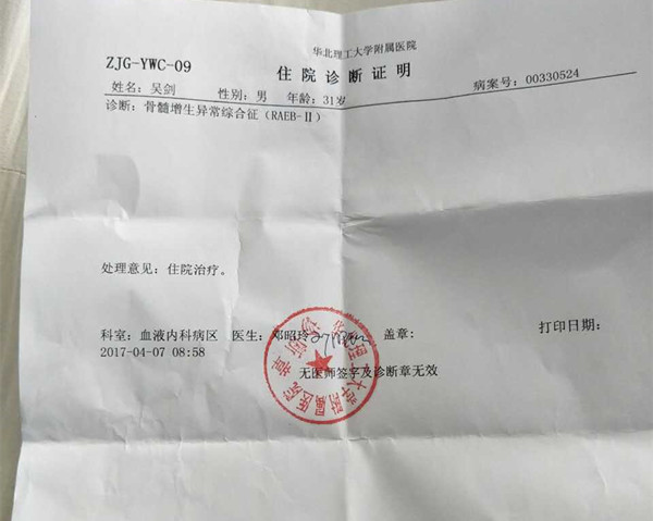 從2017年正月開始,吳劍出現(xiàn)渾身無力、頭暈等癥狀,隨后幾經(jīng)輾轉(zhuǎn)到遷安市、唐山市多家醫(yī)院檢查治療,3月13日吳劍在華北理工大學(xué)附屬醫(yī)院被確診為骨髓增生異常綜合征(MDS-RAEB-2)。因免疫力較低,吳劍腿部出現(xiàn)大面積感染,導(dǎo)致潰爛,在醫(yī)院住院治療一個(gè)多月后,吳劍腿部感染已得到控制,醫(yī)院建議病人出院,每周查一次血常規(guī),下一步可能要進(jìn)行骨髓移植,手術(shù)費(fèi)及治療費(fèi)用大約40余萬元。