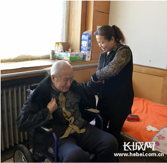 王愛英為老人穿衣服。朱艷輝 攝