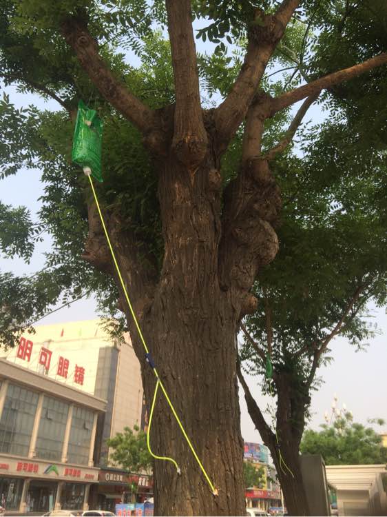 據(jù)了解,春夏之際,正是樹木生長的關鍵時期,許多樹木會在生長過程中生出害蟲,破壞樹木的生長,而為了消滅害蟲以往園林局會通過噴灑農藥的方式,但由于農藥的氣味難聞,市民意見太大且噴藥成本高,工人也不安全,故結合實際情況,園林局工作人員就采用把農藥放在輸液袋里通過輸液的方式給樹木輸送農藥。