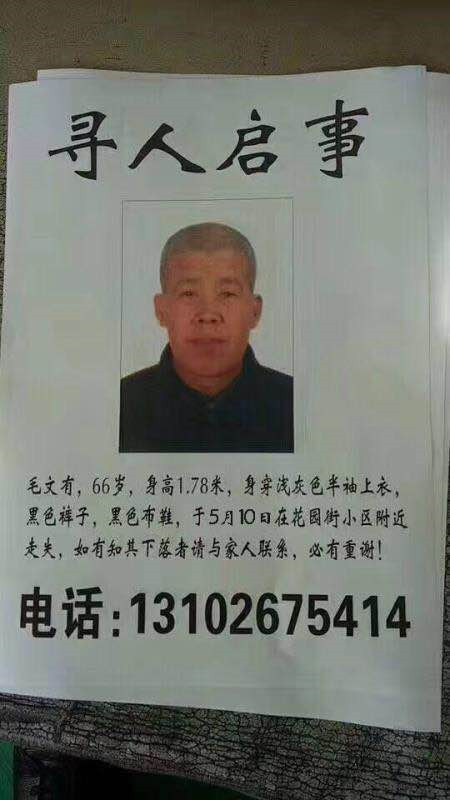 據(jù)郎先生講述,毛文友今年66歲,身高1.78米,體重150斤左右,昨天下午5點左右于花園街附近走失,走失時身穿淺灰色半袖工作服,黑色褲子,腳穿黑色布鞋。