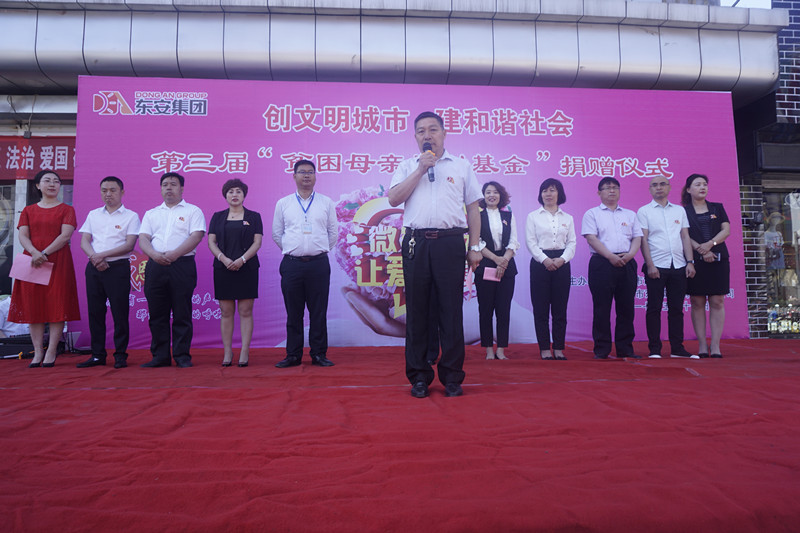 遷安市婦聯(lián)副主席張海俠發(fā)表講話,對東安集團一直以來的勇于承擔(dān)社會責(zé)任,關(guān)注貧困母親的行為給予很高的評價,并表示,東安集團的真情奉獻與慷慨資助,不僅幫助了貧困母親擺脫困境,也為我市文明城市創(chuàng)建工作增添了有力一筆。