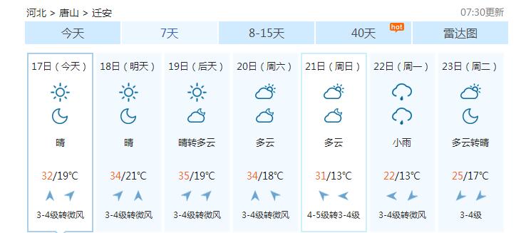 閱讀:3184遷安信息港消息:今日,小編從中國(guó)天氣網(wǎng)獲悉,遷安未來(lái)三天將持續(xù)高溫天氣,預(yù)計(jì)最高溫度將達(dá)35℃,剛?cè)胂牟痪?,遷安就將遭受高溫炎熱天氣的考驗(yàn),請(qǐng)市民做好高溫防暑準(zhǔn)備。