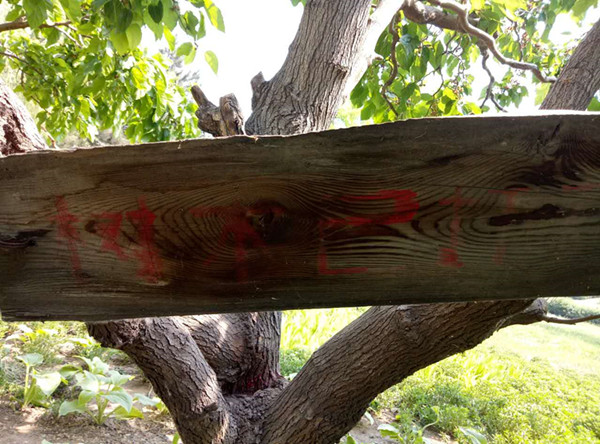 依稀可見(jiàn)的“樹(shù)木已打藥”字樣