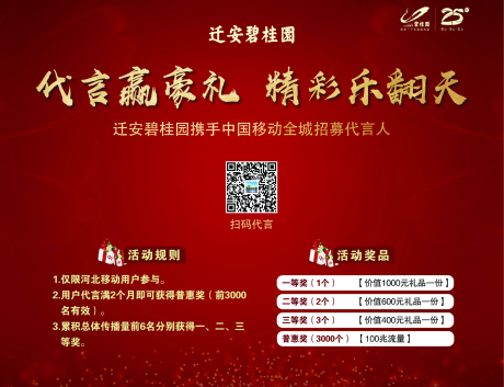 遷安碧桂園攜手中國移動(dòng)全城招募代言人,代言即可獲流量,更有機(jī)會(huì)贏的千元大獎(jiǎng),趕快掃碼代言