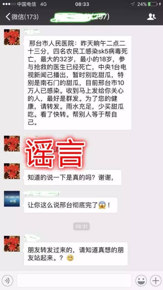 據(jù)市民發(fā)來的消息稱:“昨天晌午二點(diǎn)二十三分,四名農(nóng)民工感染sk5病毒死亡,最大的32歲,最小的18歲,參與搶救的醫(yī)生已經(jīng)死亡,中央1臺(tái)電視新聞已播岀,暫時(shí)別吃甜瓜,特別是南石門的甜瓜,目前邢臺(tái)市10萬人已感染。收到馬上發(fā)給你關(guān)心的人,最好是群發(fā)。為了您的健康,請轉(zhuǎn)發(fā)。雨水充足,少買甜瓜吃??戳丝燹D(zhuǎn)。幫別人等于幫自己”。