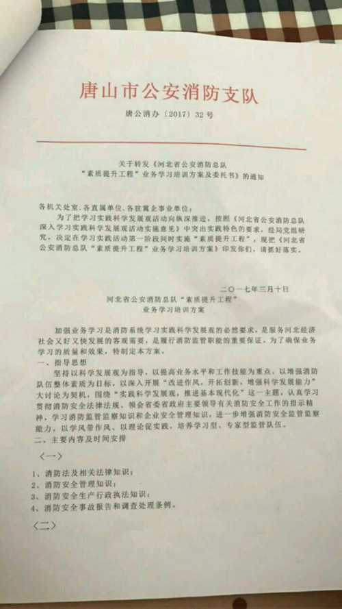 據(jù)爆料市民講述,近日單位接到一份“消防培訓(xùn)通知”,通知內(nèi)容顯示,按照相關(guān)文件,決定開展業(yè)務(wù)培訓(xùn),主要針對對象是全市范圍內(nèi)的工礦、企業(yè)、事業(yè)單位、酒店、賓館、網(wǎng)吧、餐飲娛樂場所等,培訓(xùn)時(shí)間為7月至9月期間,培訓(xùn)費(fèi)2860元,通知中表明,接到通知后三個(gè)工作日內(nèi)辦理相關(guān)培訓(xùn)費(fèi),如逾期未辦理培訓(xùn)費(fèi)或未參加培訓(xùn)的單位和個(gè)體將按有關(guān)規(guī)定處以停業(yè)整頓或吊銷營業(yè)資格并處人民幣10000-30000元罰款。在通知尾端,特別聲明了收款賬號(hào)以及相關(guān)事宜咨詢電話,咨詢號(hào)碼為兩個(gè)手機(jī)號(hào),一個(gè)歸屬地為唐山,一個(gè)歸屬地為石家莊。通知的最后還有唐山市公安消防支隊(duì)的“公章”,落款時(shí)間為2017年5月26日。