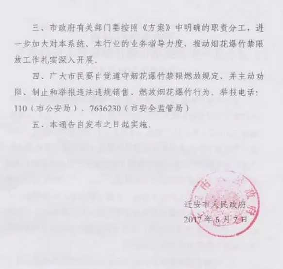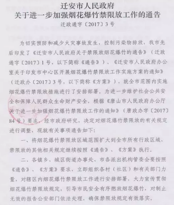 遷安市人民政府關(guān)于進一步加強煙花爆竹禁限放工作的通告正式下發(fā)