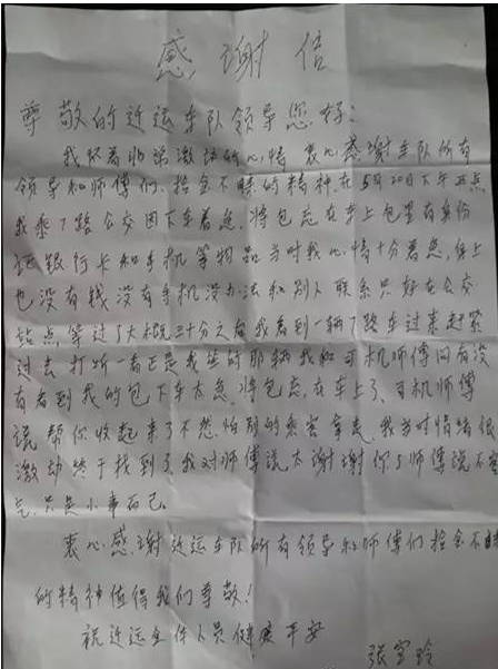 6月12日,飽含著張女士滿滿謝意的感謝信郵寄到遷運公交公司,張女士用樸實的話語,向車隊領(lǐng)導和張艷榮師傅表示感謝。