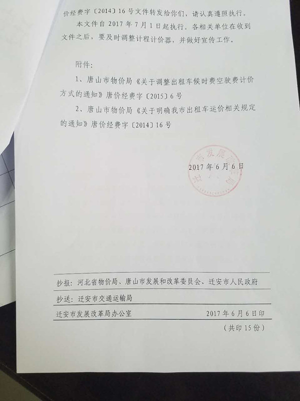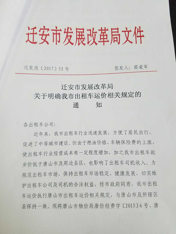 遷安市發(fā)展改革局關于出租車運價相關規(guī)定的通知文件: