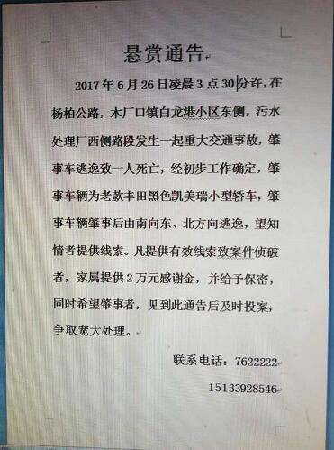 在此,望6月26日凌晨3點30分左右途經(jīng)此路段目睹該事故或有知情者請及時與交警或家屬聯(lián)系,凡提供有效線索致案件偵破者家屬將懸賞2萬元。