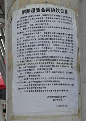 為加強(qiáng)城市文明建設(shè)的要求,依據(jù)遷安市人民政府會(huì)議紀(jì)要的精神,決定將遷安市南菜市場進(jìn)行升級改造,致使原來市場中心與各商戶簽訂的租賃協(xié)議無法履行。雙方應(yīng)解除租賃協(xié)議(注:一年以下無書面合同的享有同等權(quán)利),對此,特發(fā)出如下公告: