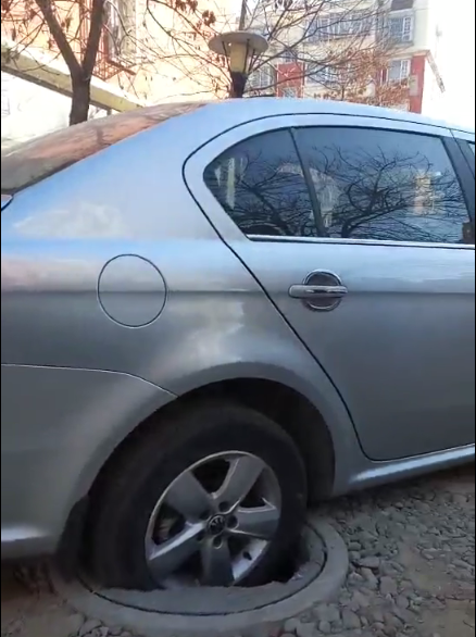 據(jù)石女士講述,11月18日下午1點半左右,石女士準(zhǔn)備開車出門,可是車剛從樓下停車位開出就輾軋到了井蓋。意想不到的一幕發(fā)生了,井蓋被軋碎了,右后車輪被卡在井口。
