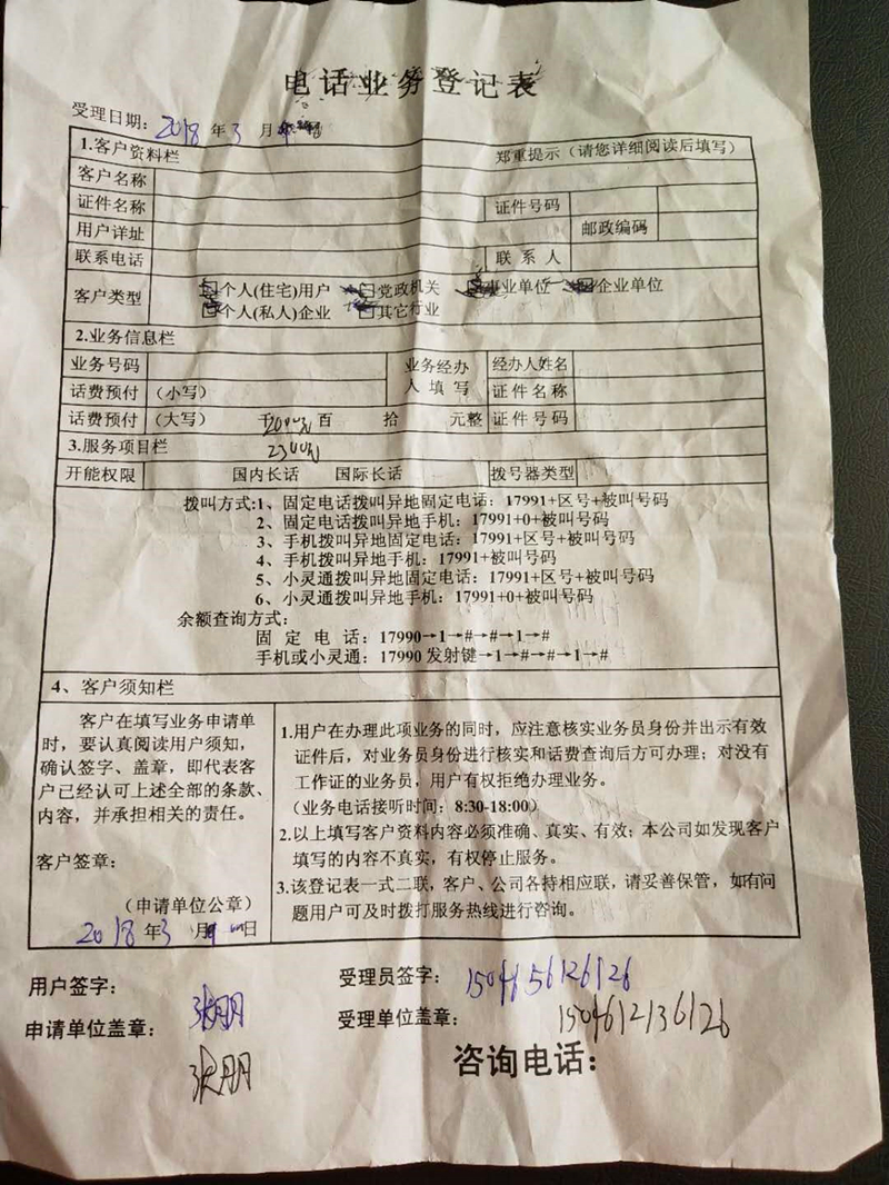 “通完話后,那男的稱我姑姑要參加充值2000送蘋果手機的活動,還要給我奶辦一個充300贈100話費的業(yè)務,總共2300塊錢,讓我奶奶先墊付”,何女士說。由于見到該男子在家已與其女兒通過電話,奶奶并未多想就將錢給了該男子,隨后該男子開具了一張電話業(yè)務登記表并表示下午會將手機送到。
